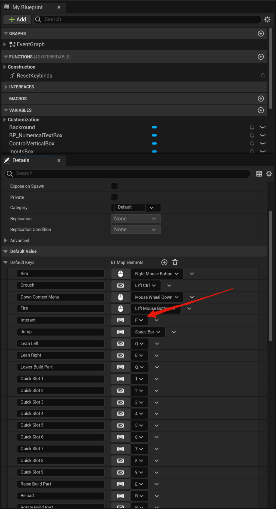 You can then set the key bind you want to use. Then go to the BP_ControlsSettings then go to the Event Graph and select the Default Keys variable in the My Blueprint panel, then in the Details panel you can see all the default keys for each action, find the action your changing the default key for and change the key bind there to the same as you set in the SGKCharacterMappings.