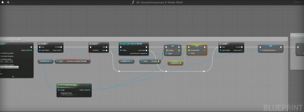 Next go to the BP_MasterProjectile and create a new variable set its type to Float and call it Damage Multi and then set its default value to 1! Then copy the images below, locations at the tops. There are 2 in the Range Attack function because you need to do the changes in 2 places.
