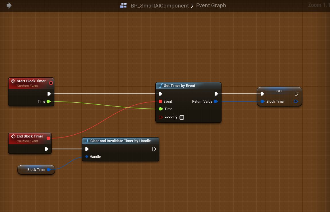 Next go back to the BP_SmartAIComponent and go to the event graph and create a new custom event called Start Block Timer add a input called Time and set its type to float.
