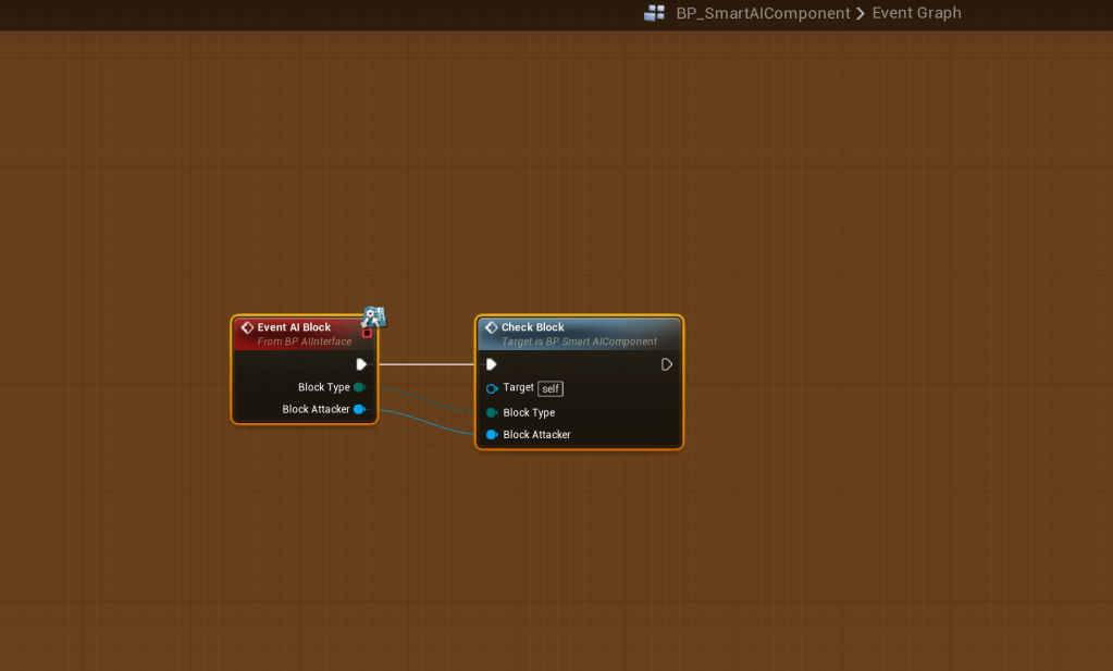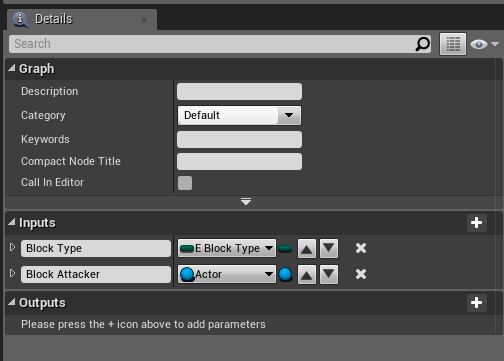Next open the BP_AIInterface blueprint and create a new function called AI Block, then 2 inputs the first call Block Type and set the variable type to E_BlockType. The second input call Block Attacker and set the variable type to Actor. It should look like the image below.