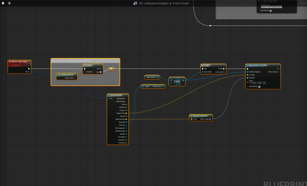 Go to the BP_AIMasterHoldable and in the event graph create a new custom event called Multicast Melee Emitter. Set it to Multicast and tick reliable. Then add an input called Hit and set the variable type to Hit Result.