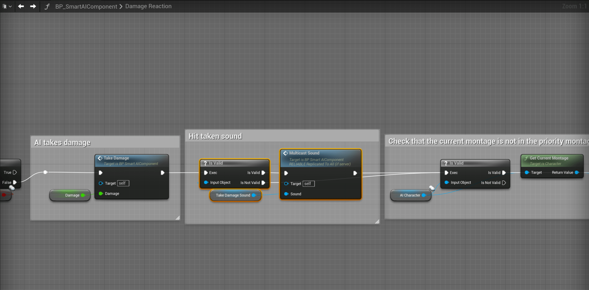 Open the DamageReaction function and add the nodes shown in the image below.