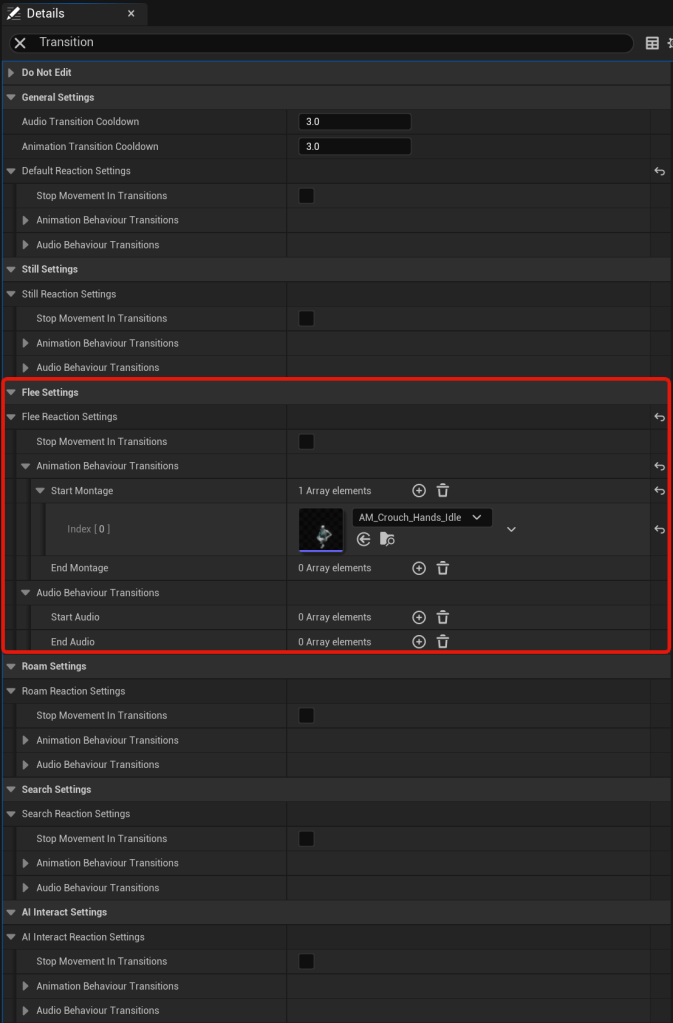 You can find these settings by going to the AI character blueprint such as the BP_Zombie then select the BP_AIComponent in the Component panel, then in the Details panel search for Transition. Here you can set Transition animations and sounds for each behavior.