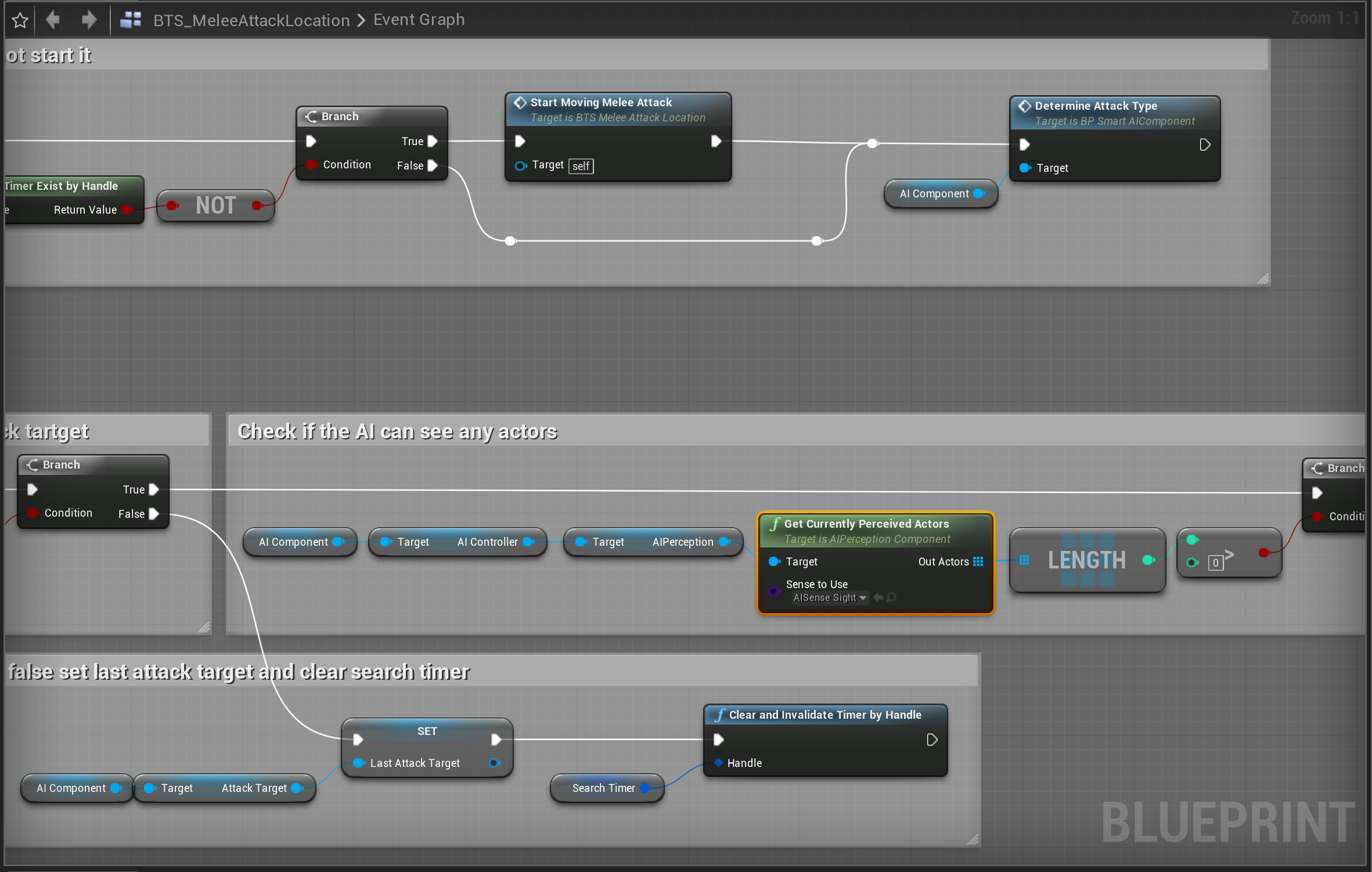 Smart AI – Changed Get Perceived Actor to Get Currently Perceived Actors Replace the Get Perceived Actor node with the Get Currently Perceived Actors node like shown in the image below, then set the Sense to Use as the AISense Sight on the node.