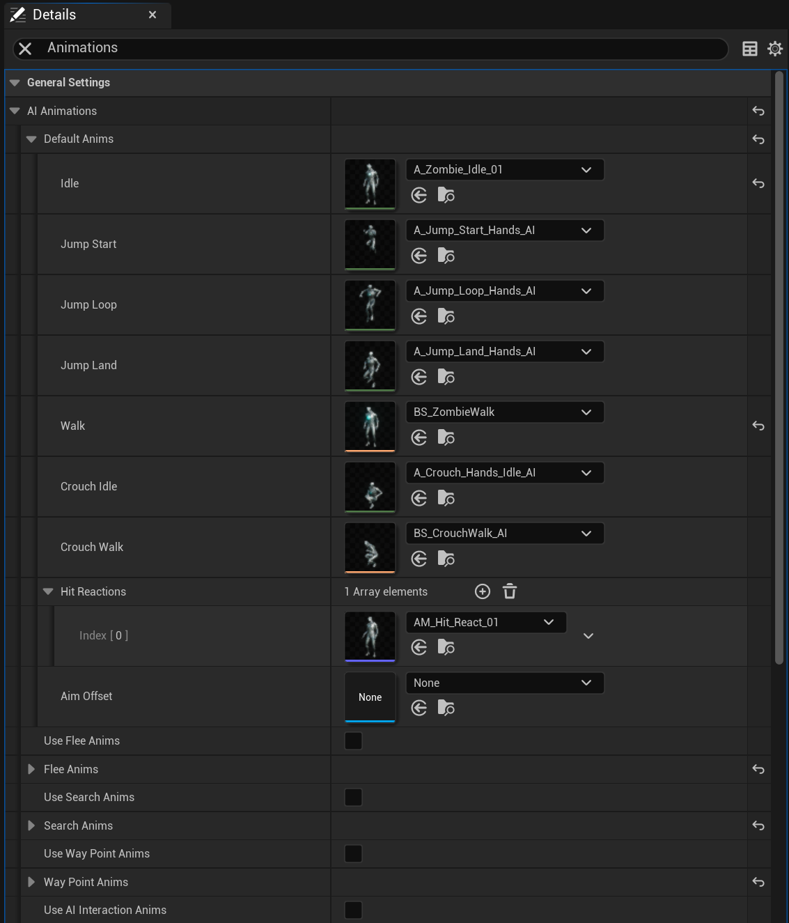 Now with the BP_AIComponent selected in the details panel search for Animations. Here you will be able to set all the AI’s unarmed animations for each behaviour. By default these are disabled and only the Default Anims are used.