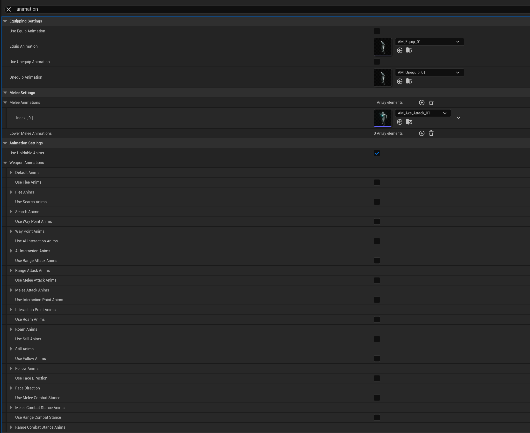 You will also find additional animation setting here for equipping and unequipping, Melee Animations and Range Attack animations. For info on adding new melee animations check the guide below, its is important you follow this as new melee animations require additional steps.