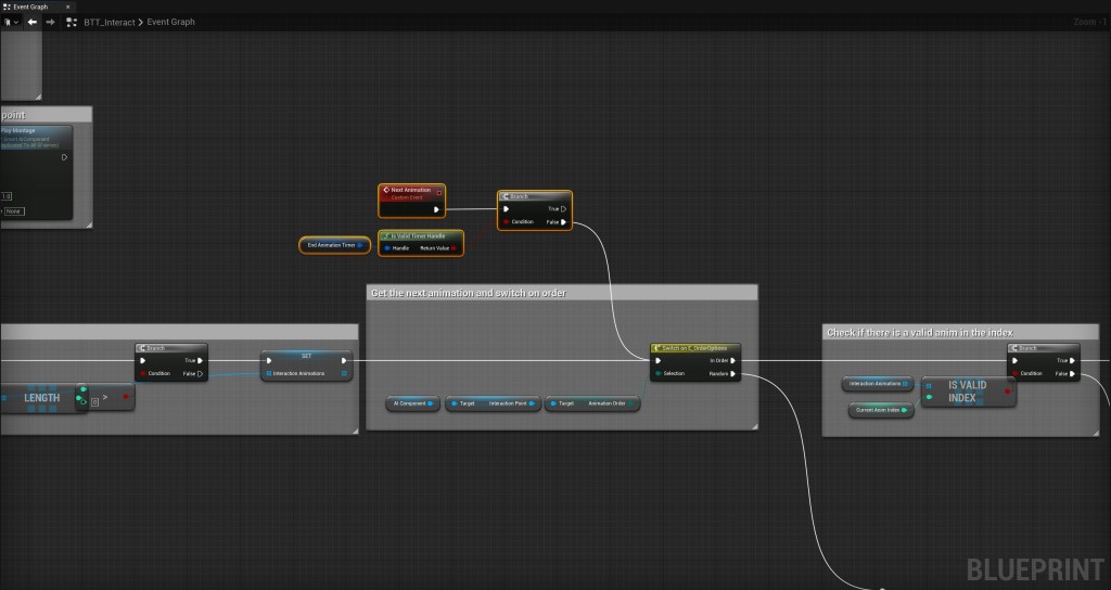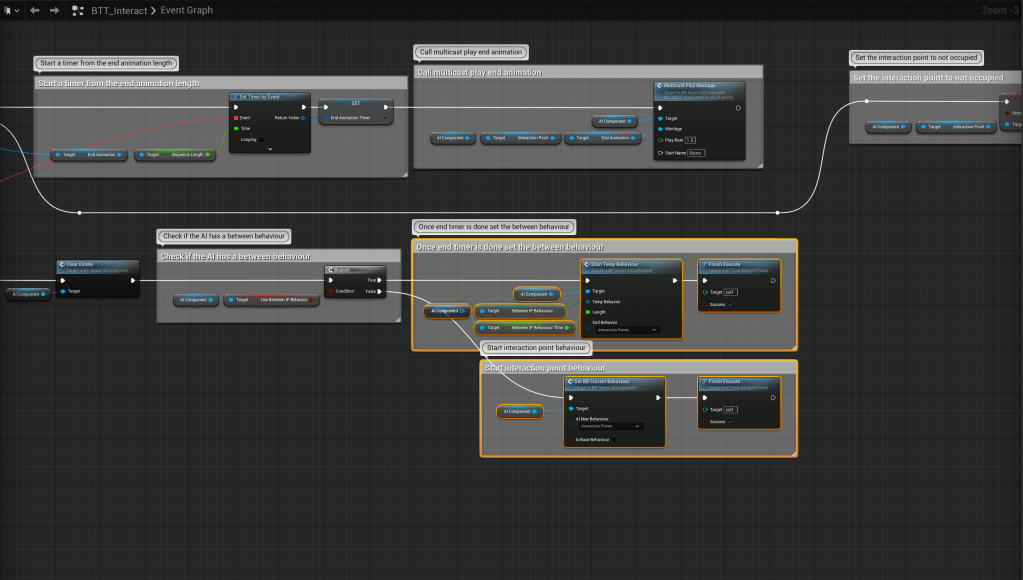 Smart AI – Fixed AI not playing correct Interaction Point animations Go to the BP_Interact blueprint and make your code look like the image below. Add the highlighted nodes shown in the image below, location at the top of the image.
