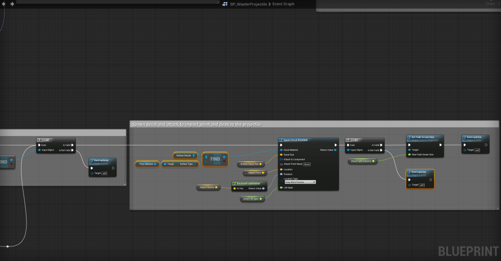 Smart AI – Fixed decals not working on clients Add the highlighted nodes shown in the image below, location at the top of the screenshot. Note there are 2 Spawn Decal Attached nodes in the BP_MasterProjectile make sure both look like the image below.