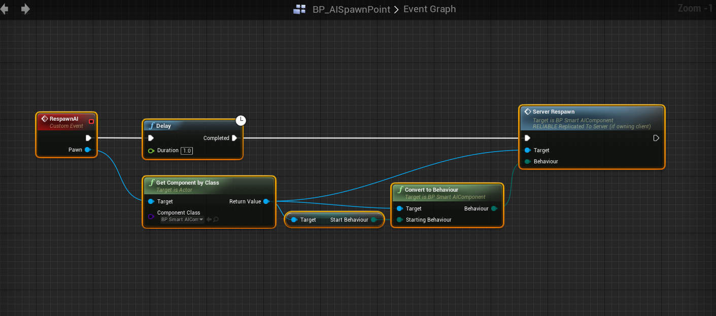 Go to the BP_AIManager and create a new custom event called RespawnAI and add an input called Pawn and set the variable type to Pawn. Then copy the image below.