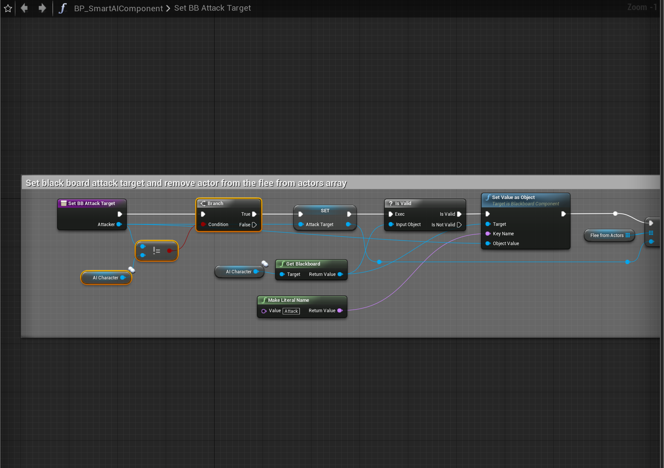 Smart AI – Fixed follow AI trying to attack itself Go to the BP_SmartAIComponent and then go to the Set BB Attack Target and add the highlighted nodes shown below.
