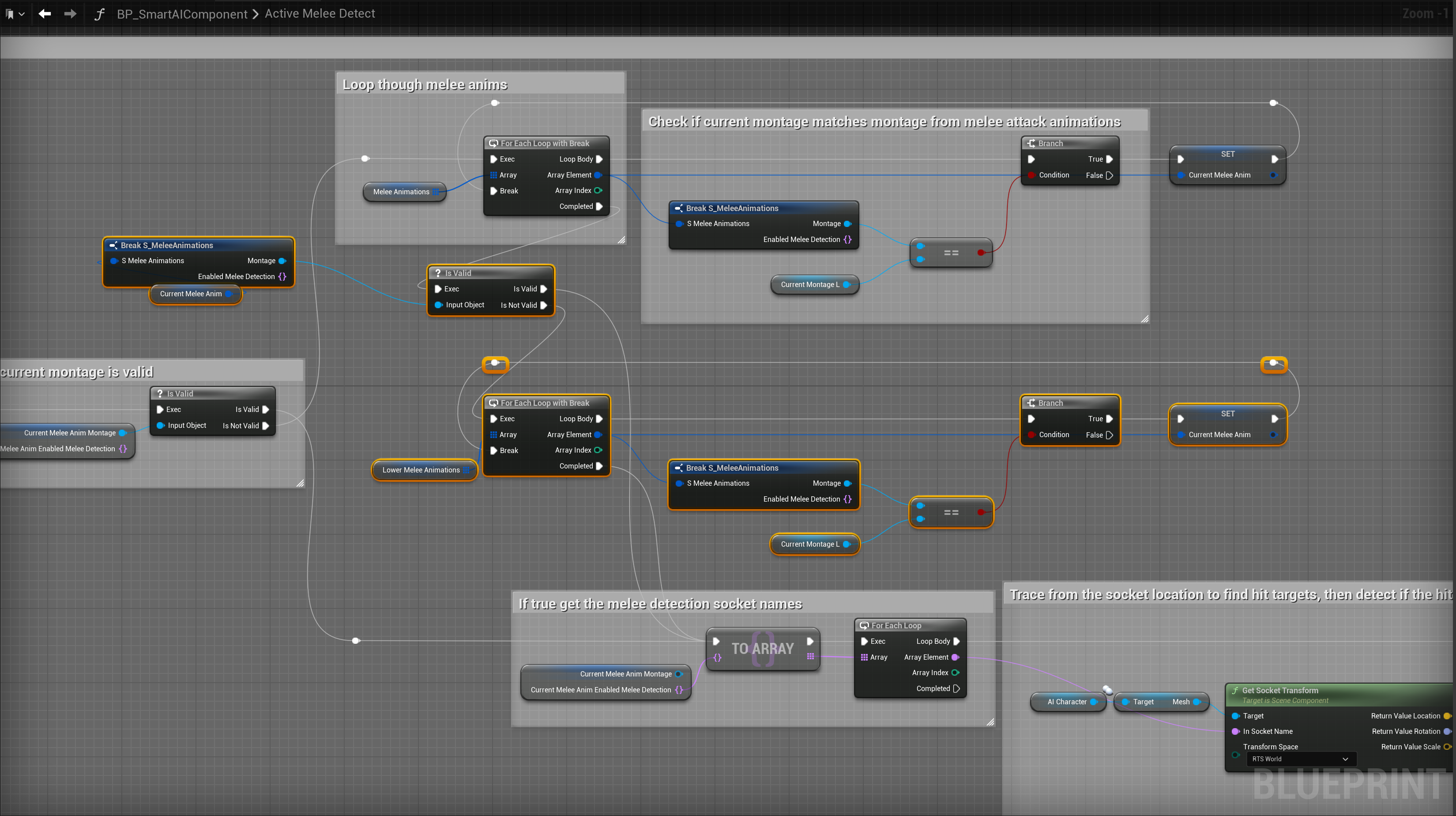 Smart AI – Fixed Lower Melee Anims Trace Sockets Not Working Open the BP_SmartAIComponent then go to the ActivateMeleeDetect function and copy the image below.