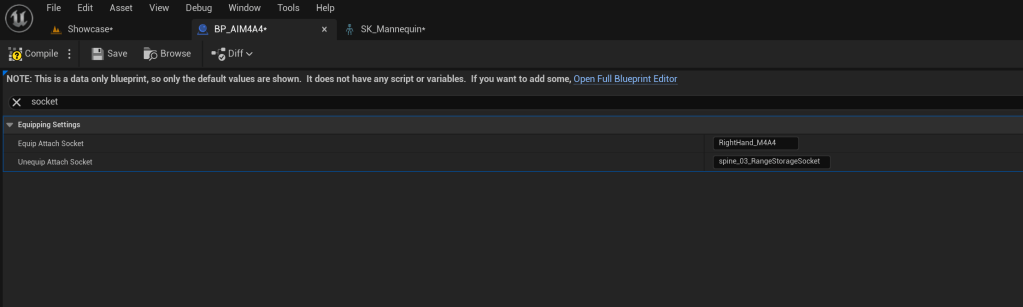 Next go to the BP_AIM4A4 and change the Unequip Attach Socket setting to spine_03_RangeStorageSocket like the image below.