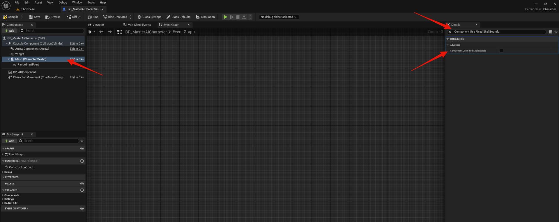 Smart AI – Fixed Skeletal Mesh Bounds Setting Open the BP_MasterAICharacter then select the Mesh component and in the Details panel search for Component Use Fixed Skel Bounds and untick the option.