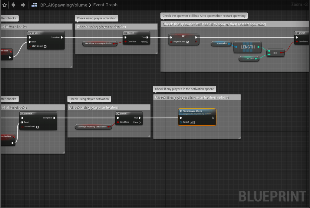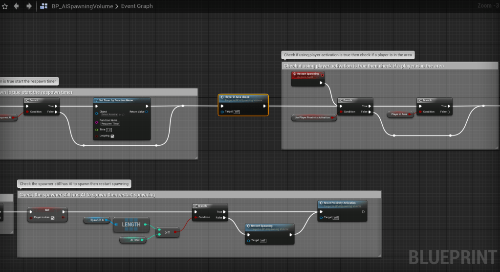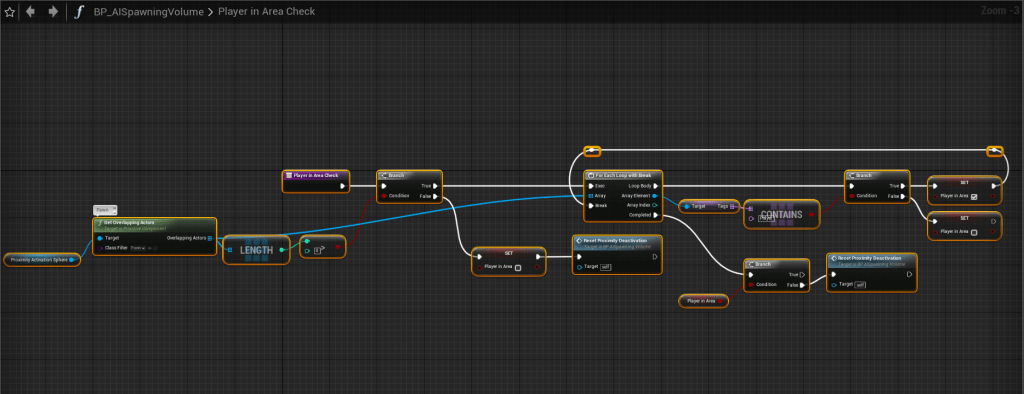 Go to the BP_AISpawningVolume and create a new function called PlayerInAreaCheck and copy the images below.