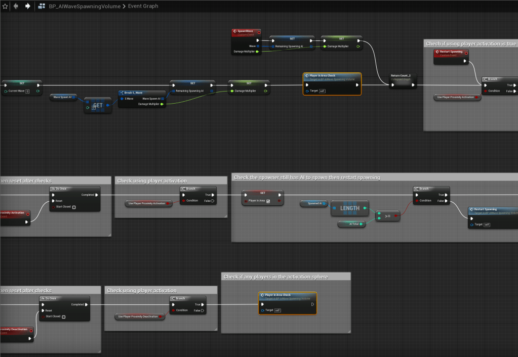 Go to the BP_AIWaveSpawningVolume and create a new function called PlayerInAreaCheck and copy the images below.
