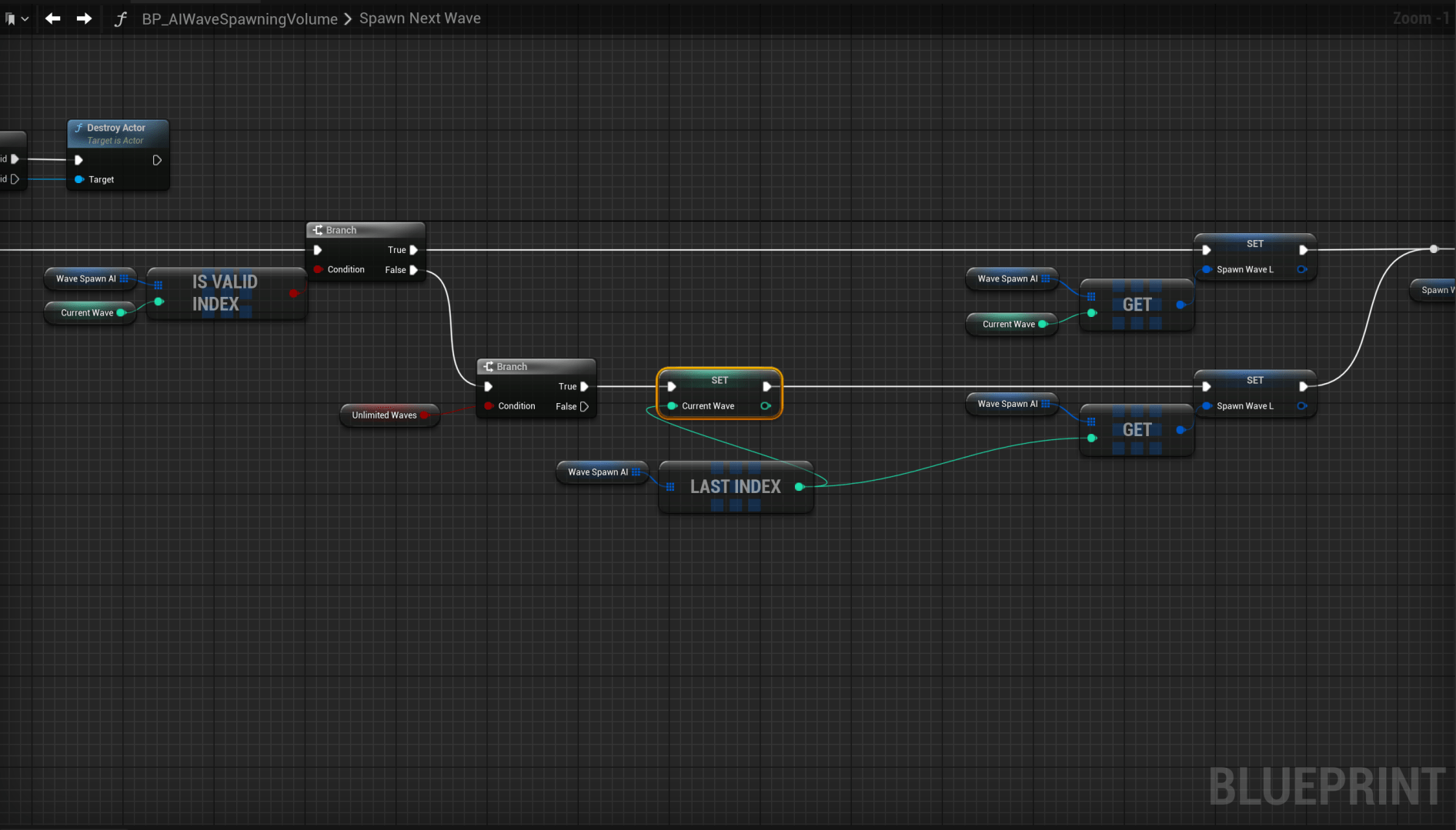 Smart AI – Fixed Wave Spawner Warning Open the BP_AIWaveSpawnerVolume then open the SpawnNextWave function and add the highlighted nodes in the image below.