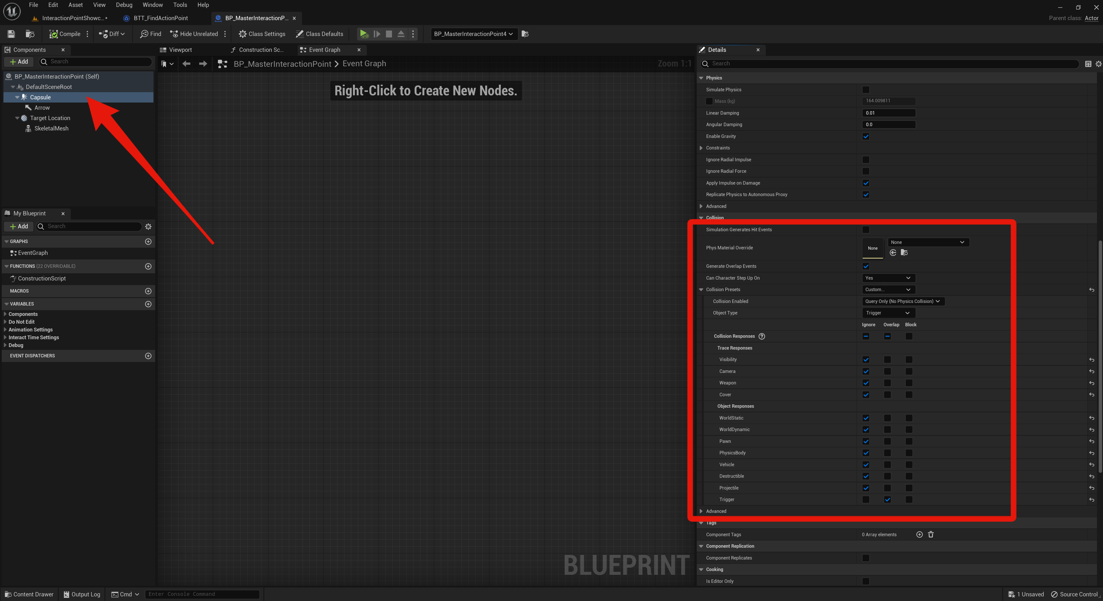 Go to the BP_MasterInteractionPoint blueprint and select the Capsule component and copy the collision settings in the image below.