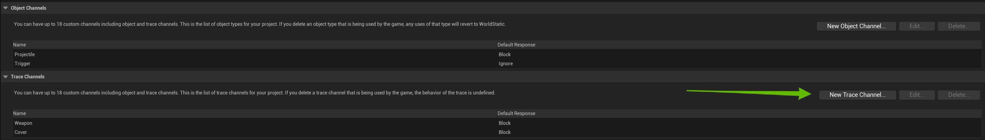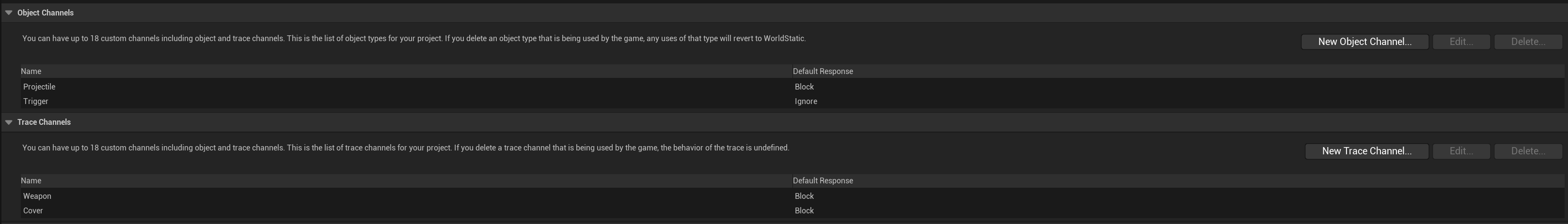 Set the Name to Weapon and the Default Response to Block, then click Accept and click the New Trace Channel button again and set the Name to Cover and set the Default Response to Block and click Accept again. Once done you collision settings should look like the image below.