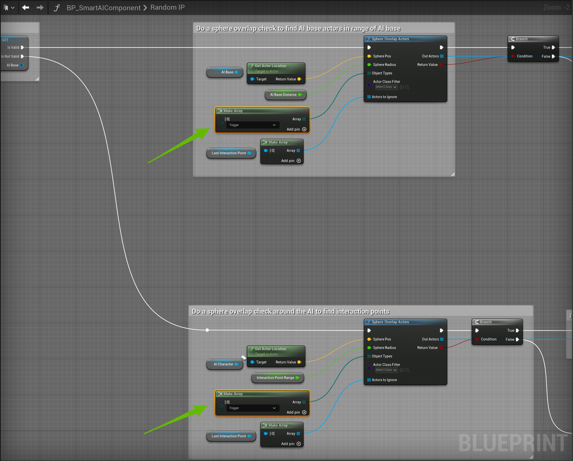 In the BP_SmartAIComponent in the My Blueprint panel search for Random IP and go to that function and set the Make Array nodes like the image below.