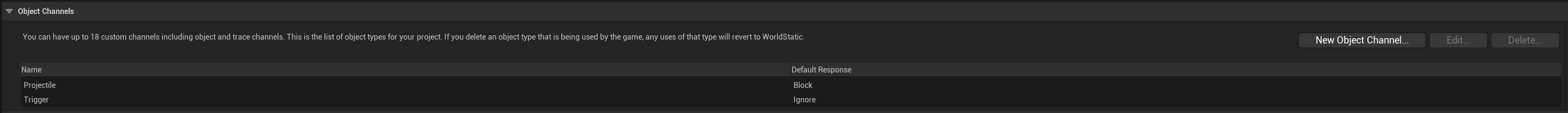 Then click the New Object Channel button and set the Name to Projectile and set the Default Response to Block then click the Accept button. It should now look like the image below.