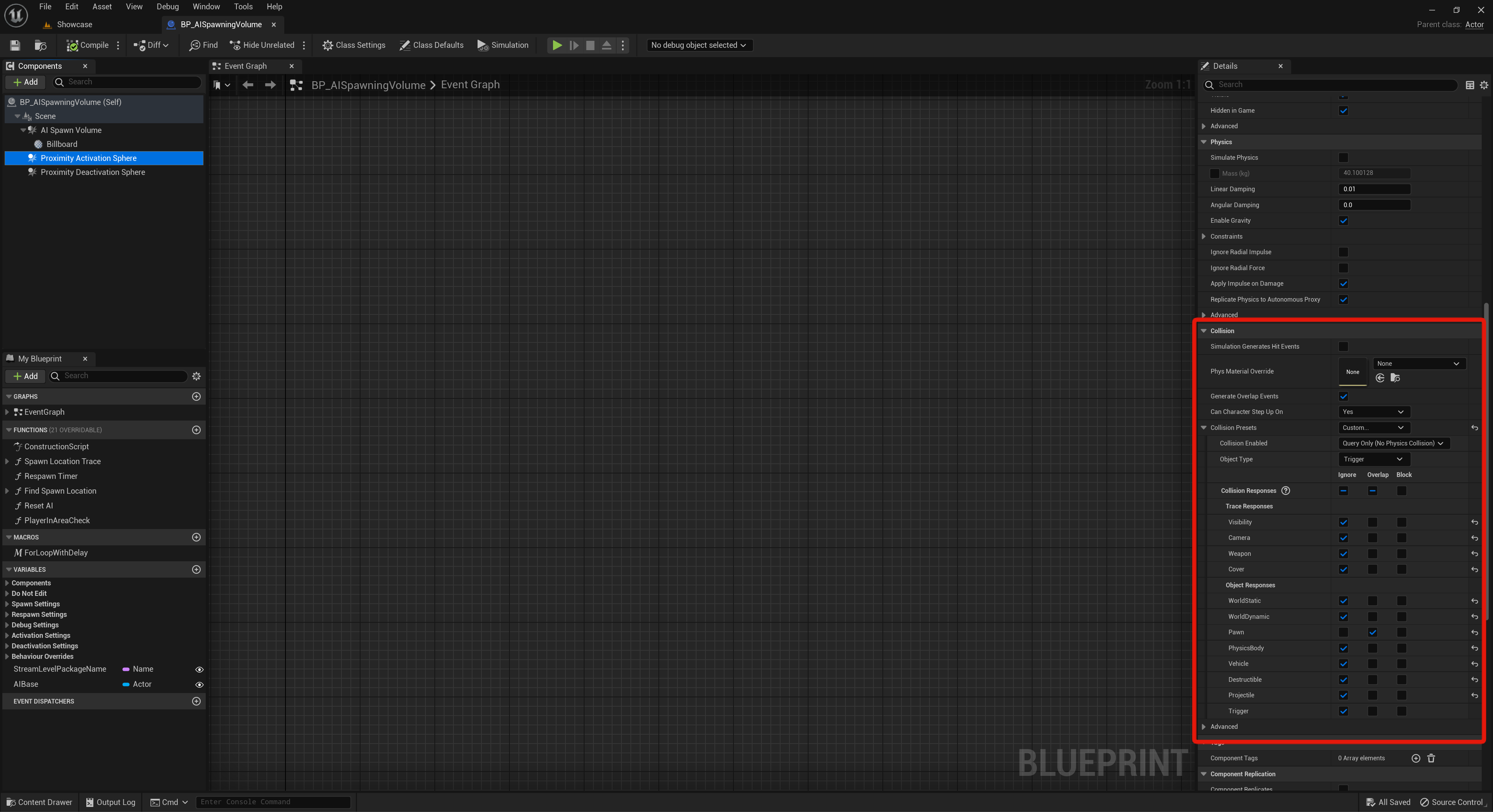 Then open the BP_AISpawningVolume and select the Proximity Activation Sphere Component and in the Details panel set the collision settings like the image below, set everything to Ignore except the Pawn which should be set to Overlap and make sure your set the Object Type to Trigger.