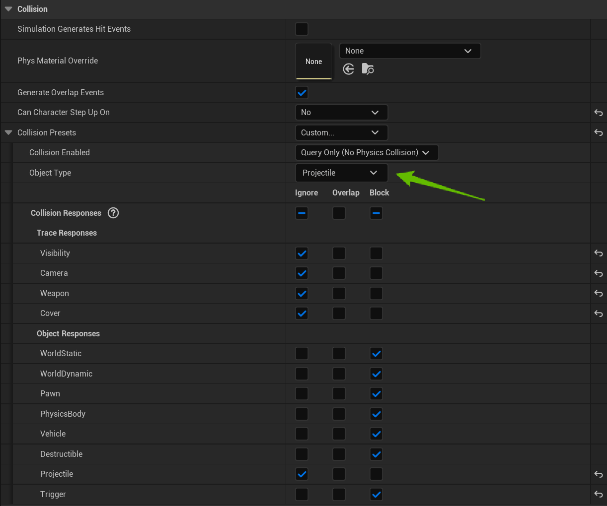 Next go to the BP_MasterProjectile blueprint found in the Projectiles folder. The select the Projectile Collision component in the components panel. Then in the details panel find the collision setting and set the Object Type to Projectile like the image below shows.