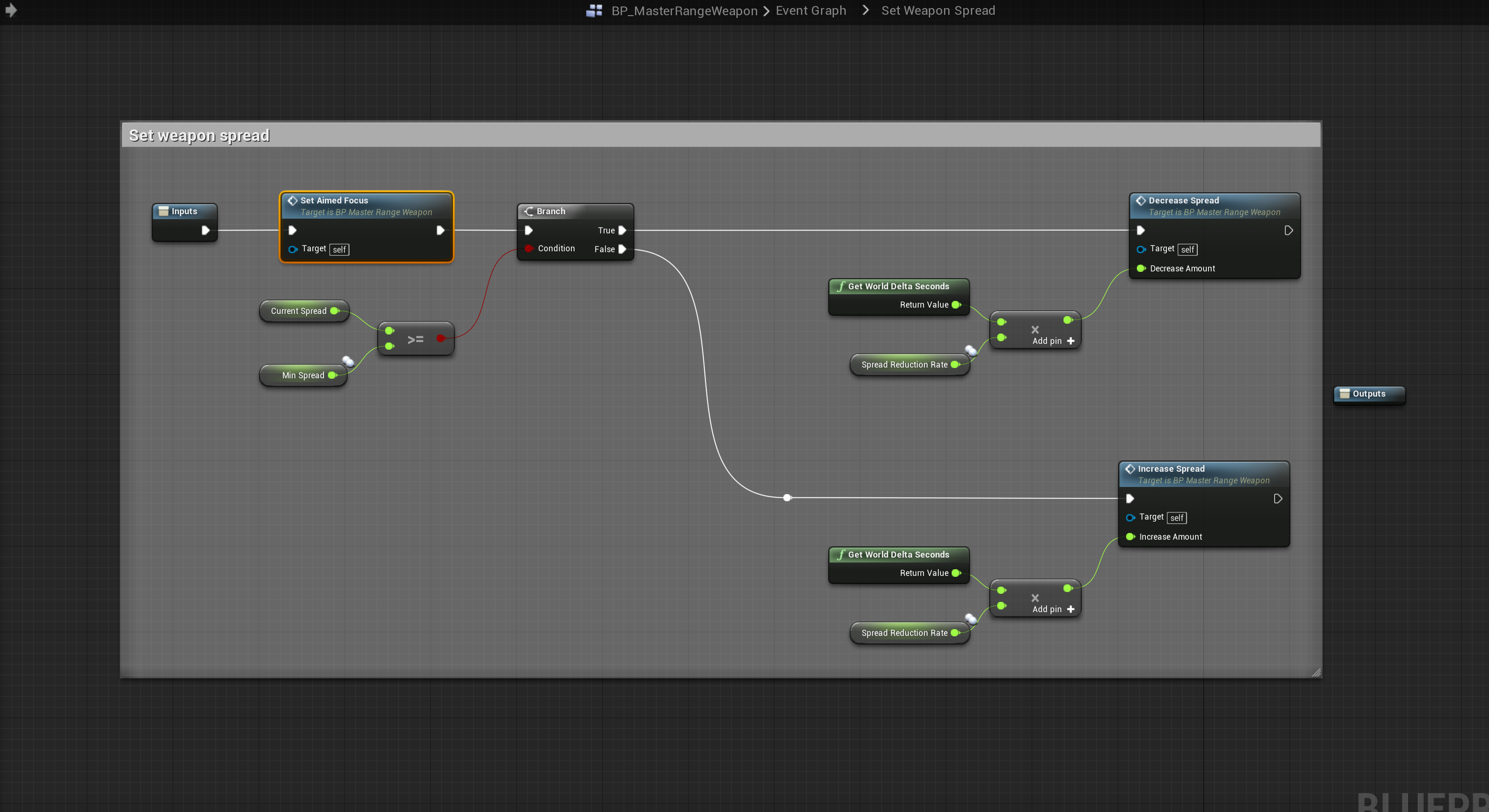 Go to the BP_MasterRangeWeapon and create a new function called Set Aimed Focus. Then copy the image below, make sure you set the Trace Channel input to Weapon on the LineTraceByChannel node.