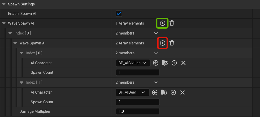 In the image above you can see that the first wave (wave 0) is set to spawn 1 civilian and 1 deer with a Damage Multiplier of 1. If I wanted to add the setting for the next wave I would click the + in the green box, and if I wanted to add another AI to spawn in wave 0 I would click the + in the green box.
