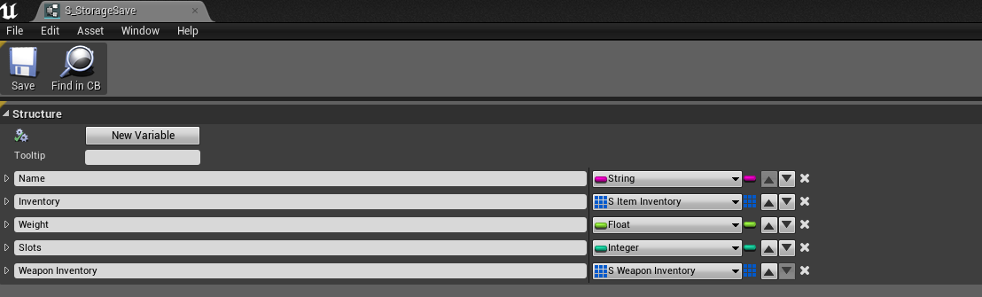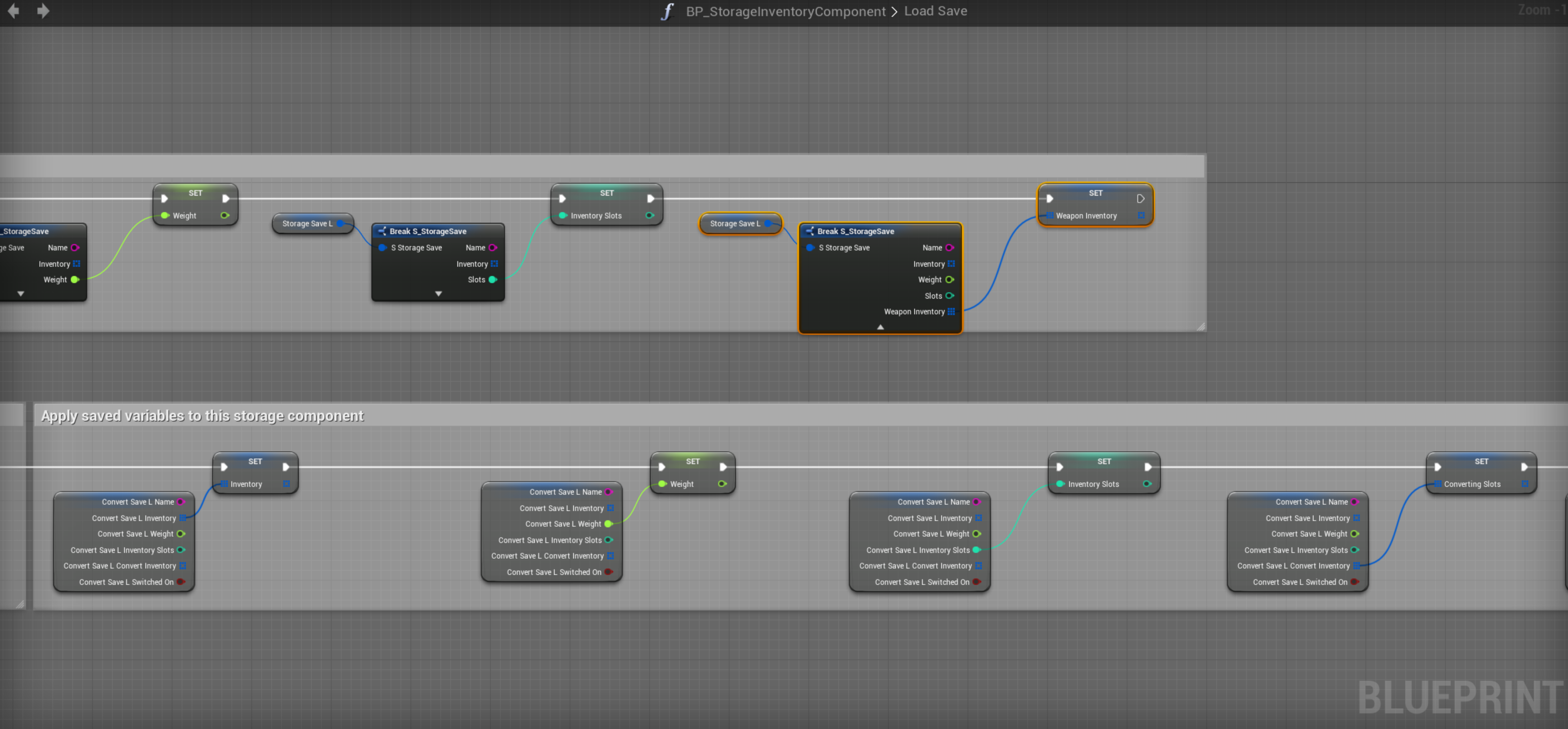 The will be an error on Make S_StorageSave node right click and refresh the node then click the down arrow to show the weapon inventory pin.