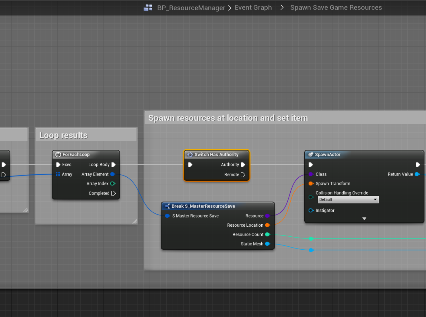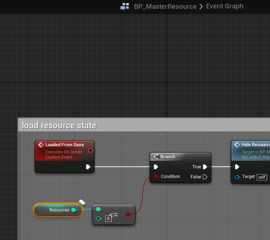 Fixed resource respawn on load Select the event shown below and change it to Run on Server and tick reliable. Add the highlighted node shown below Select the resources node and in the details panel change the replication setting to Replicated
