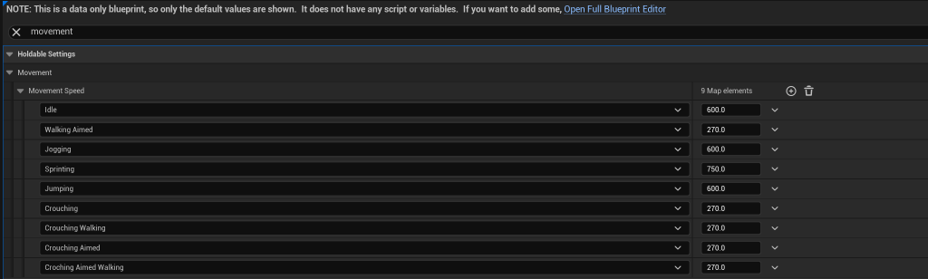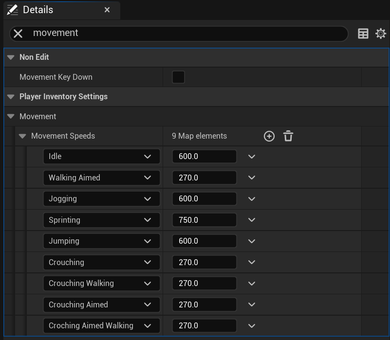 To change the movement speed settings in SGKv1 go to the BP_PlayerInventoryComponent, then go to the Class Default and search for Movement and you should find the settings shown in the image below, here you can set the movement speeds for each player state.