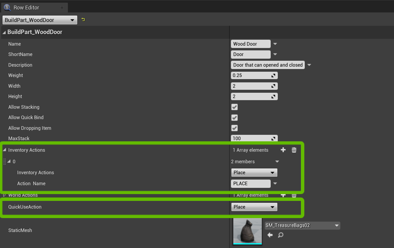Next set the QuickUseAction to Place, this means if the item is set in the quick bar and you activate the item using the key bound to that quick slot the item will be used to place the build part.