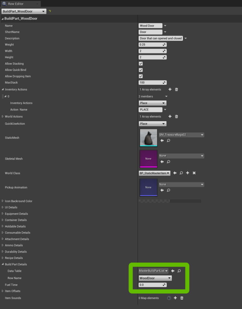 Next set go to the Build Part Details, the set the Data Table to MasterBuildPartList. Last set the Row Name to the build part that you want the item to place. Once this is done your finished and can use the item to place build parts by either right clicking it in the inventory and selecting the PLACE option or dragging the item to a quick slot and pressing the key that quick slot is bound to.