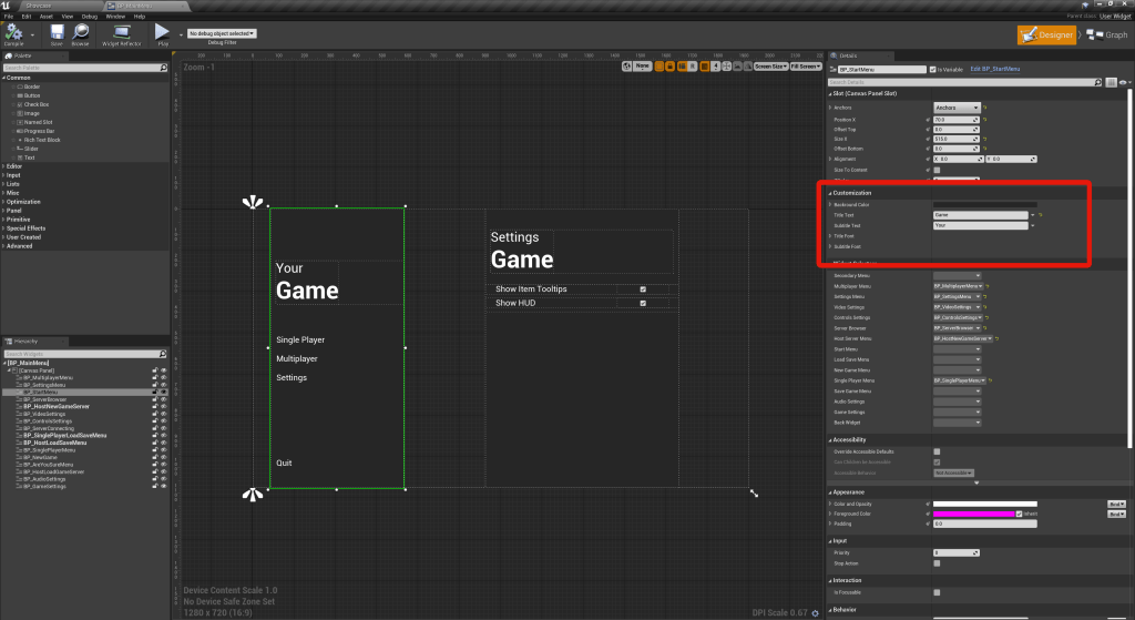 Please note if you do not know how widgets work then I strongly suggest watching the videos on it and making backups before making changes as you can break you project. Any changes you make past the customization settings you will have to workout your self as that is no longer SGK specific but is to do with UE4 and Widgets blueprints.