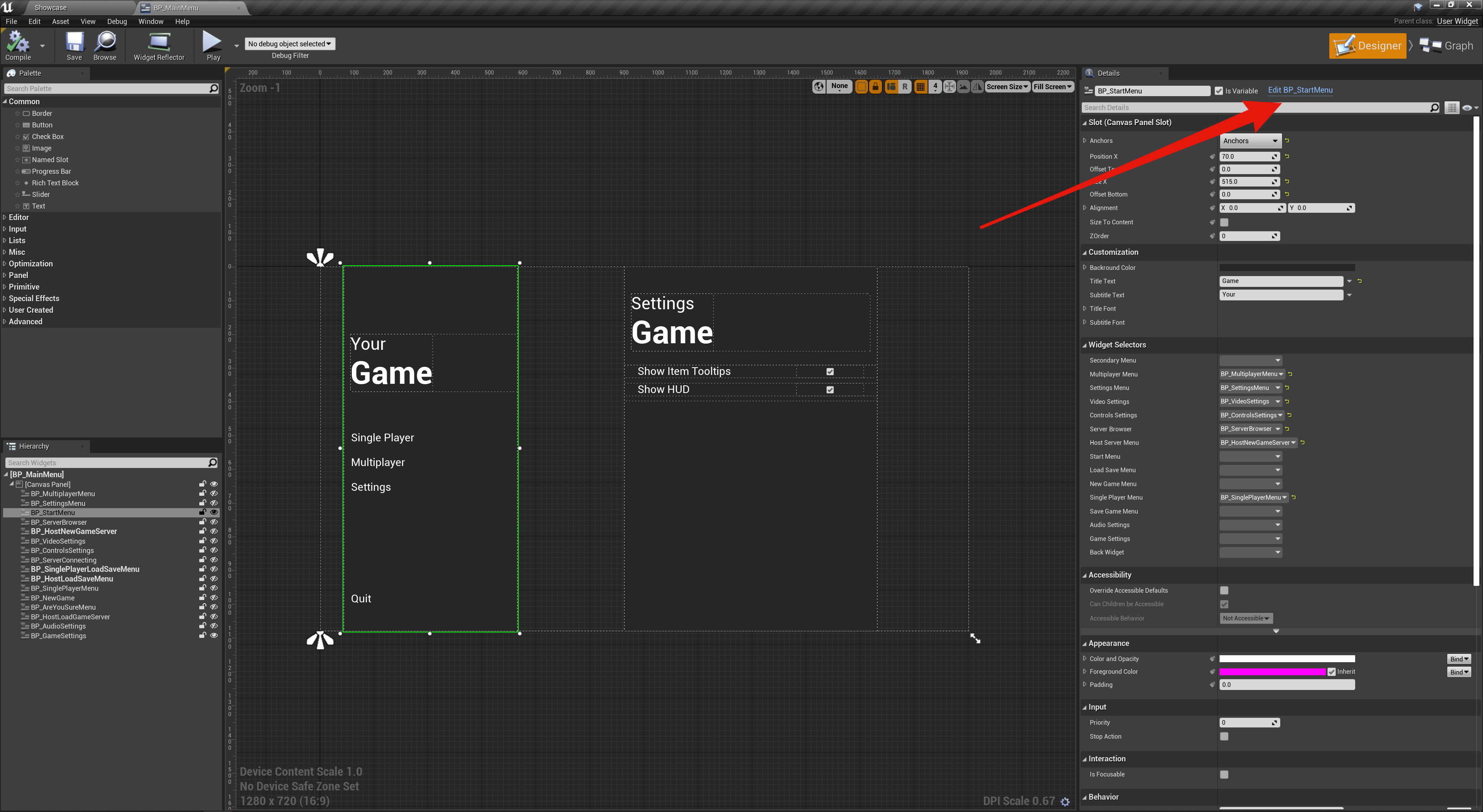 If you want to change more about the widget then is allowed in the settings here you can select it and then select the Edit BP_StartMenu (This is an example name, the name will be what ever widget you curranty have selected) option like shown in the image below, this will open that widget which will allow you to change anything you want in that widget.