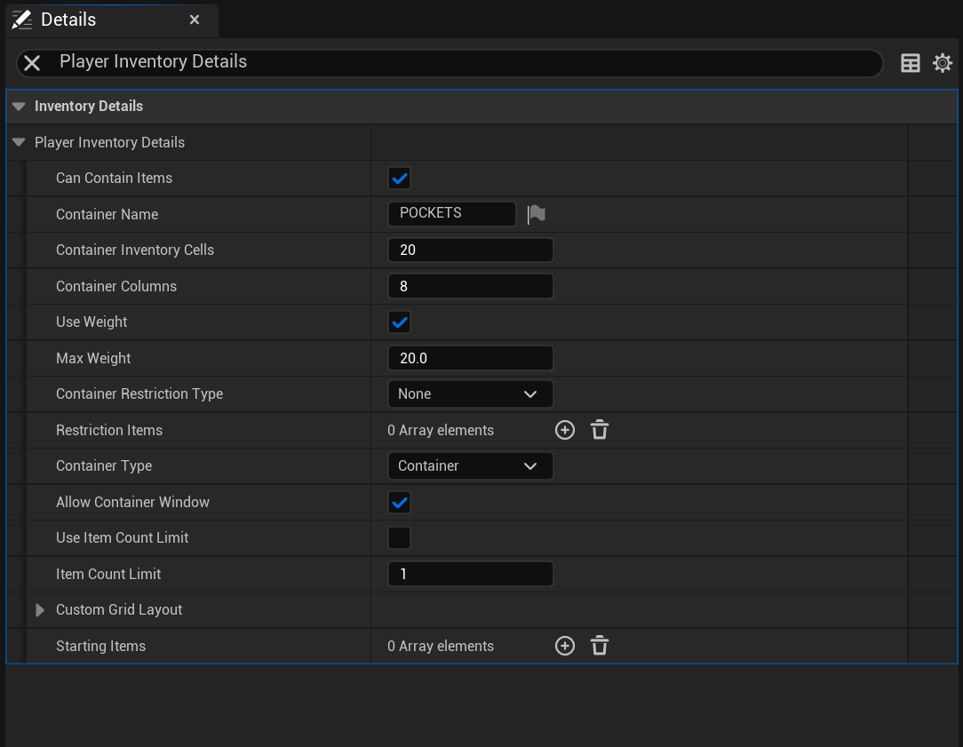 To change the inventory settings of the player go to the BP_SGKController select the BP_PlayerInventory in the Components panel and search in the Details panel for Player Inventory Details.