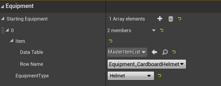 To add a new starting equipment item click the + icon then set the Data Table to MasterItemList. Next set the Row Name to the item you want to have added to the equipment slot when a new game begins. Then set the Equipment Type to the slot you want this equipment to be equipped to. The item will now be equipped in the set slot, if in the item list it is set to be a container and has starting items set it will contain these items.