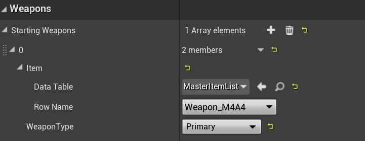 The add a new starting weapon click the + icon then set the Data Table to MasterItemList. Next set the Row Name to the item you want to have added to the weapon slot when a new game begins. Then set the Weapon Type to the slot you want this weapon to be equipped to. The item will now be equipped in the set slot, if its a range weapon it will have its default attachments which can be set in its holdable blueprints class defaults.