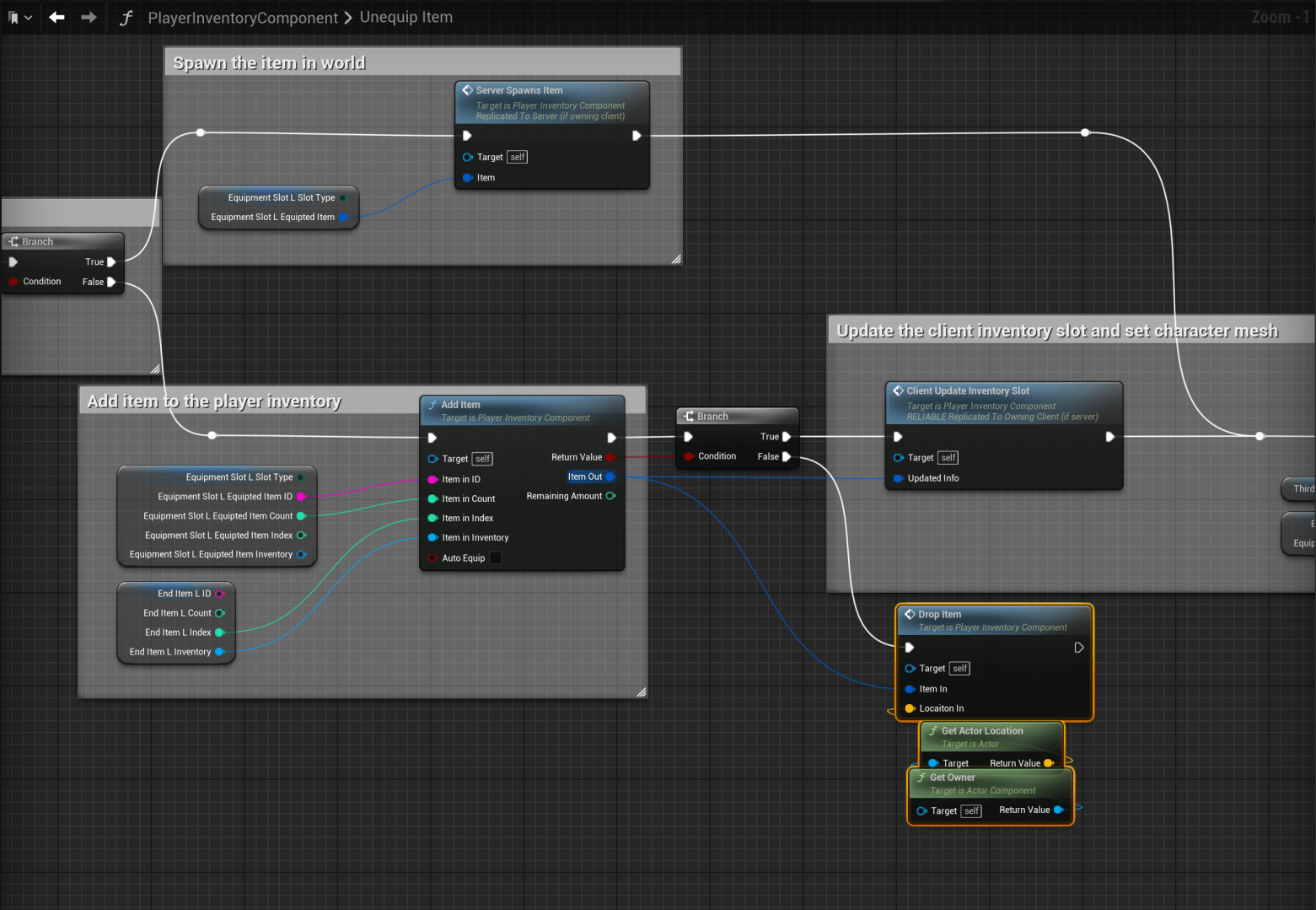 Survival Inventory – Fixed Unequip Item Not Working Correctly Open the PlayerInventoryComponent then open the Add Item function and add the highlighted nodes shown in the image below. Then open the Unequip Item function and add the nodes shown in the image below.